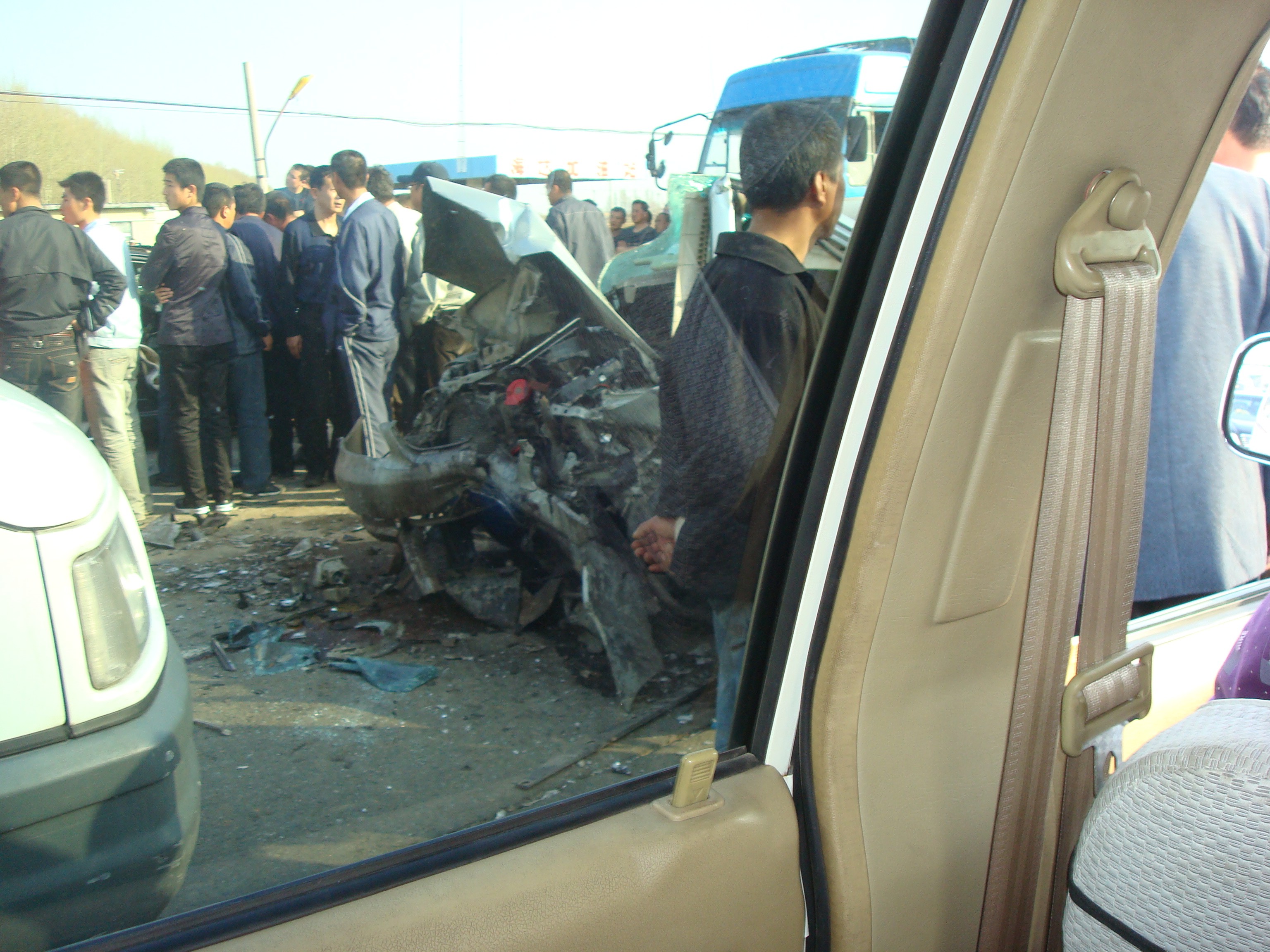 眼前的一幕把我们惊呆了,在道中间横着两辆轿车,车头直接相撞。已经撞的面目全非,车体已经严重变形。零件散了一地,车附近地上是一滩滩的血,两辆车的驾驶员满头满身都是血,而且还不断的在流血。他们挤在变形的驾驶室内无法动弹,其中一个的大腿骨已经明显骨折,趴在变了形的方向盘上向围观的人气息微弱的求救,情况十分危急。有一两个人在努力的拉着车门,但车门紧锁拉不开,肇事地点位于德惠和长春中间距离最近的医院也有三十多公里,人们只能无可奈何的等待119救援人员来,边上有两个伤势较轻的家属一边哭一边求助,眼看这个人就要不行了,而车门打不开就无法实施急救,围观的人们也连连叹息。