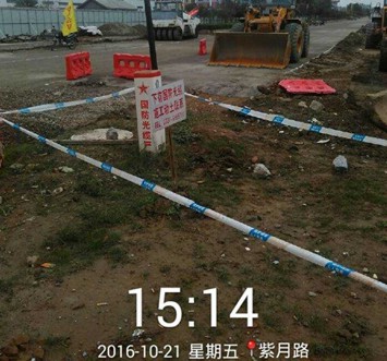 处理方案:探明光缆准确位置后,布设“四道防线”,用白灰划分施工安全范围,目前计划改架空300米避开施工区域。
