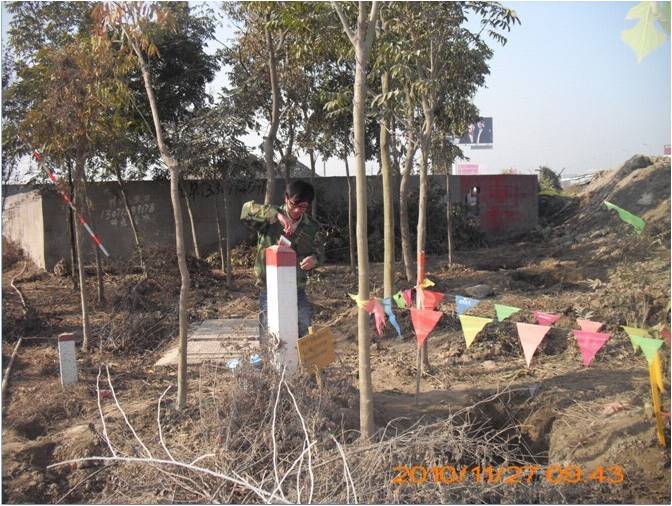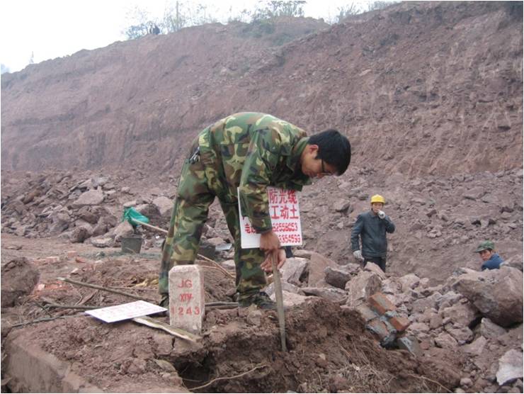 乐至县扩大城区建设,修城市二环路和高速公路连接线,影响我司光缆十四公里,1月11日开始,在天童大道一期工程县医院至黑山羊基地施工,影响我光缆线路JG0066-JG0080#标石约1公里线路,施工方与部队协商将我方光缆挖出用槽钢加固并深埋处理。挖出光缆六百米,我每天都在现场值守,晴天一身灰,雨天一身泥。