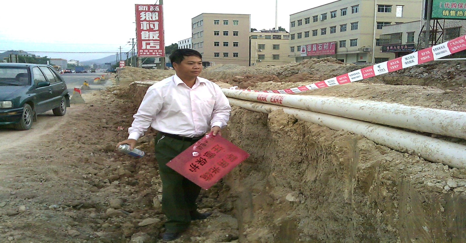 自从惠东乌塘桥到收费站324国道13公里公路拓宽施工开工以来,一直严重影响我司线路安全。工地上大型挖土机、钻井机、推土机等各种机械在工地上穿梭作业,多次在我方线路上开挖沟槽、做排水沟、填土、打桩、钻探路基。为了保护线路安全,做好线路维护工作,我坚持对此段线路一天三巡或多巡的原则,只要哪里有动土我都会第一时间赶到现场监督施工,对施工人员一次又一次地指明我司光缆的走向、深度和告知破坏光缆的严重性等。目前此段线路施工日益增多,我司光缆也大部分都露在地面,为了防止光缆被破坏或被捡垃圾的人员拾走,我每天清早一段一段地查看并做好线路保护措施,对每处在露光缆喷上油漆、竖立警示牌、挂警示标语、拉警戒带、做好四道防线;并向附近的居民发放传单做宣传工作,每隔一段距离定个宣传点,留下我们的电话、联系方式,把保护工作做到深入人心,只要有施工动土都可以第一时间通知到我们。每到一处施工现场的时候我都会跟施工人员多次指明我司光缆的走向,并要求他们施工前必须挖探沟,在现场督导施工进度,跟进每处的施工动态,防止他们野蛮作业,和同路由单位一起保护好光缆的畅通。